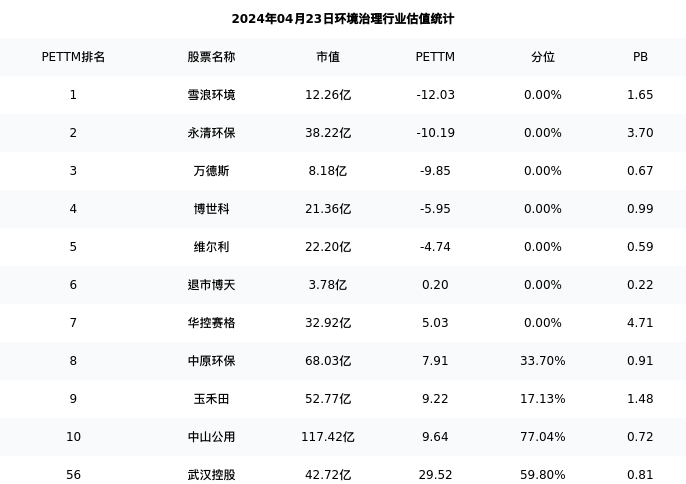 武汉控股最新报告期数据为年报,下表汇总了环境治理行业内市值靠前的公司年报主要经营数据