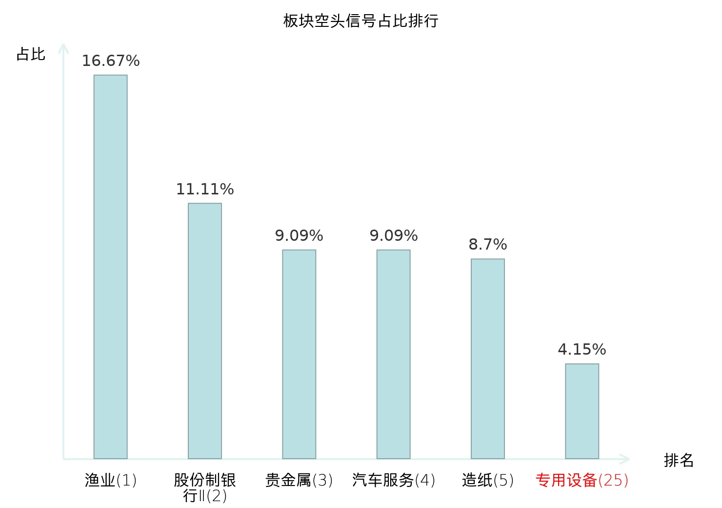 全市场所有行业板块中主力空头信号占比排名中,渔业板块位居第一。电机Ⅱ板块名次提升最快,较昨日上升113位。