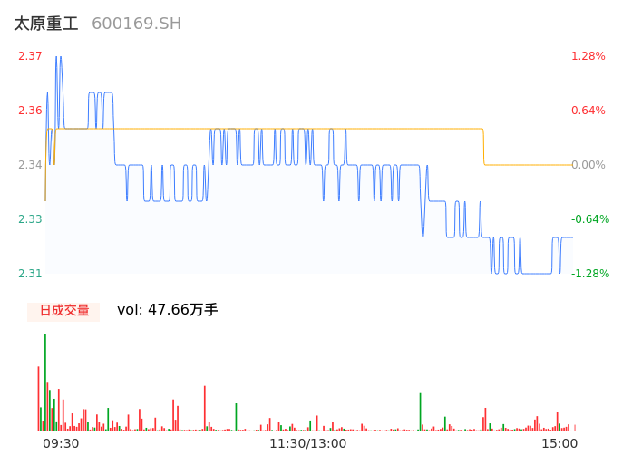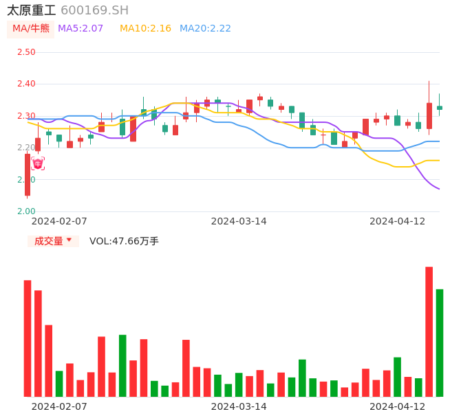 04月12日,太原重工收报2.32,股价涨幅-0.85%,成交金额1.12亿元,换手率1.43%。