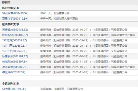 上证报中国证券网讯 11月4日,2家公司临停:ST张家界、亚星化学,1家公司复牌:ST太重。