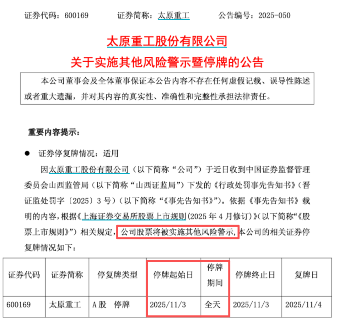 太原重工被罚800万元,多人被市场禁入,将被“戴帽”。太原重工(600169)10月31日公告,因公司于近日收到山西证监局下发的《行政处罚事先告知书》。依据《事先告知书》载明的内容,根据相关规定,公司股票将被实施其他风险警示。公司股票将于11月3日停牌1天,11月4日起被实施其他风险警示,股票简称由“太原重工”变更为“ST太重”,实施其他风险警示后股票价格的日涨跌幅限制为5%。7月25日晚间,太原重工宣布收到中国证监会出具的《立案告知书》。因公司涉嫌信息披露违法违规,中国证监会决定对公司立案。10月31日晚间,太原重工披露公司及相关人员收到山西证监局下发的《行政处罚事先告知书》。经查明,2012年,太原重工与黑龙江瑞好科技集团有限公司合作开发建设黑龙江省杜尔伯特蒙古族自治县拉弹泡300MW风电工程项目(以下简称“拉弹泡项目”),约定太原重工向拉弹泡项目销售风力发电主机设备,总承包拉弹泡项目风电场工程,并提供项目建设资金。太原重工通过提前确认拉弹泡项目风力发电主机设备收入、结转成本且少计相关收入和成本,多计拉弹泡项目自采塔筒收入、少计和跨期结转自采塔筒成本,虚增除自采塔筒外其他风电场工程业务收入、成本,少计融资租赁财务费用的方式,导致太原重工2014年至2018年、2020年和2021年年报存在虚假记载。同时,太原重工在2020年非公开发行股票申请文件中引用了个别年度的部分财务数据,构成虚假记载。山西证监局认为,太原重工上述行为涉嫌违反2005年《证券法》和2019年《证券法》的相关规定,构成信息披露虚假记载行为。太原重工时任董事、总经理范卫民,为完成考核指标,组织协调提前确认拉弹泡项目风力发电主机设备销售收入和虚增拉弹泡项目除自采塔筒外其他风电场工程业务收入,是太原重工2014年至2018年年度报告虚假记载的直接负责主管人员。太原重工时任董事长王创民,知悉拉弹泡项目实际进展情况和存在的问题,是太原重工2014年至2018年年度报告虚假记载的直接负责的主管人员。太原重工时任董事、副董事长张志德,知悉拉弹泡项目实际进展情况和存在的问题,以及该项目确认的风力发电主机设备销售收入不符合实际销售情况的问题,是太原重工2014年至2018年年度报告及2020年非公开发行股票申请文件虚假记载的直接负责的主管人员。太原重工时任财务总监贺吉,知悉提前确认拉弹泡项目风力发电主机设备销售收入情况,未审慎关注拉弹泡项目融资租赁费用长期挂账情况,未采取有效措施进行财务管控和监督,是太原重工2014年至2018年年度报告虚假记载的直接负责的主管人员。山西证监局拟决定:对太原重工股份有限公司责令改正,给予警告,并处以800万元罚款,对范卫民采取终身证券市场禁入措施;对王创民采取10年证券市场禁入措施;对贺吉采取3年证券市场禁入措施;对张志德采取10年证券市场禁入措施。相关人员还被处以警告和罚款等处分。太原重工表示,公司生产经营活动正常有序开展,所涉及项目2021年已完工,相关项目资产2024年已全部剥离,风险已出清,不会对公司未来生产经营产生任何影响。公司将做好相关工作并在满足条件后争取尽快申请撤销风险警示。