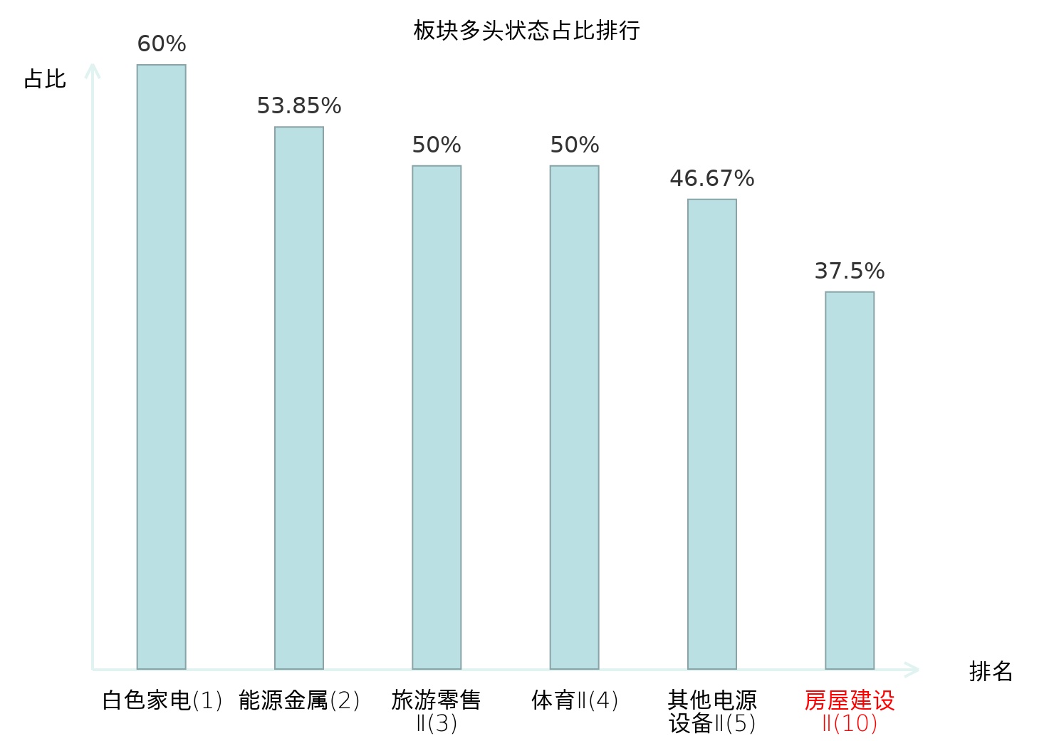 全市场所有行业板块中主力多头状态占比排名中,白色家电板块位居第一。体育Ⅱ板块名次提升最快,较昨日上升127位。