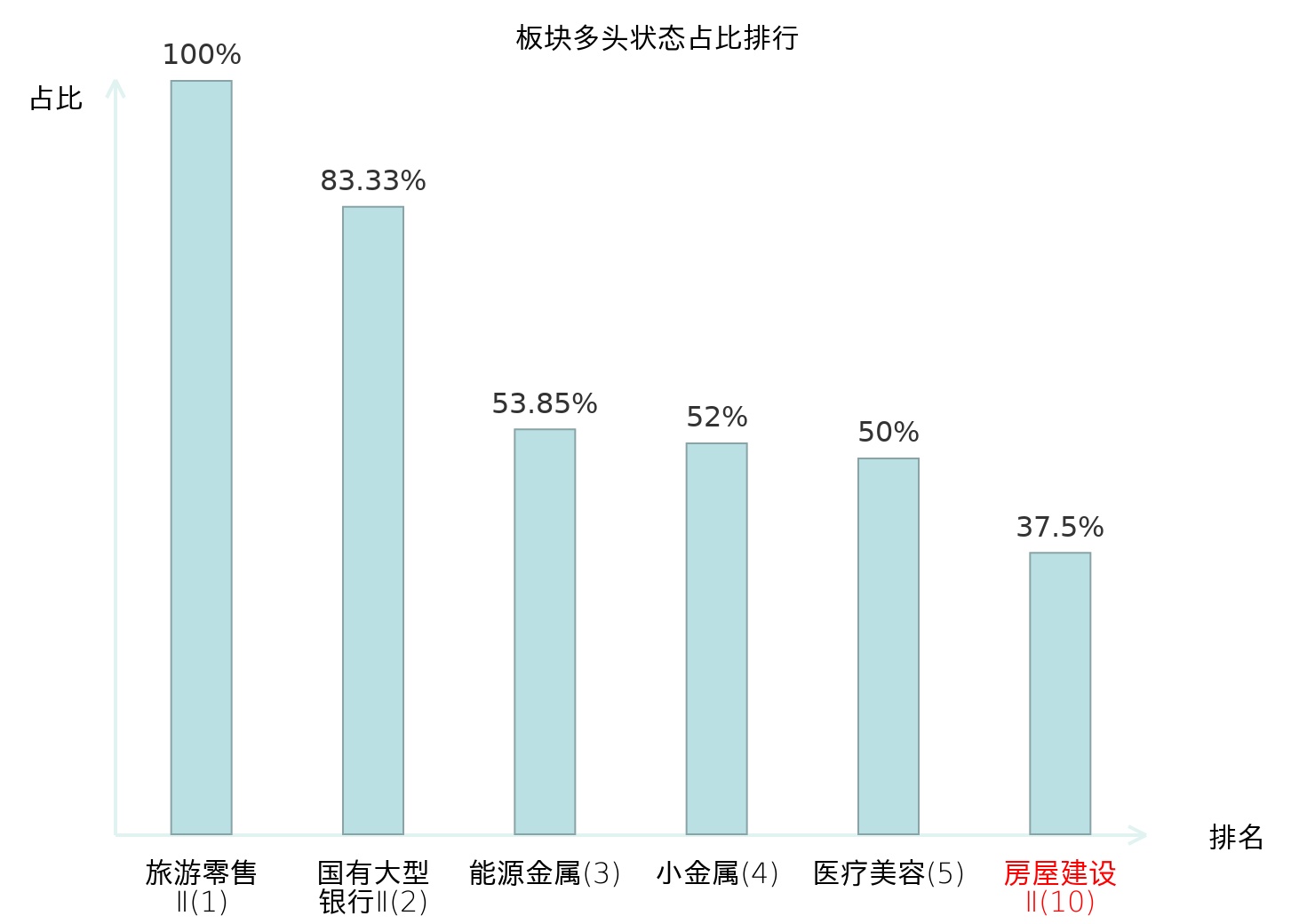 全市场所有行业板块中主力多头状态占比排名中,旅游零售Ⅱ板块位居第一。旅游零售Ⅱ板块名次提升最快,较昨日上升130位。
