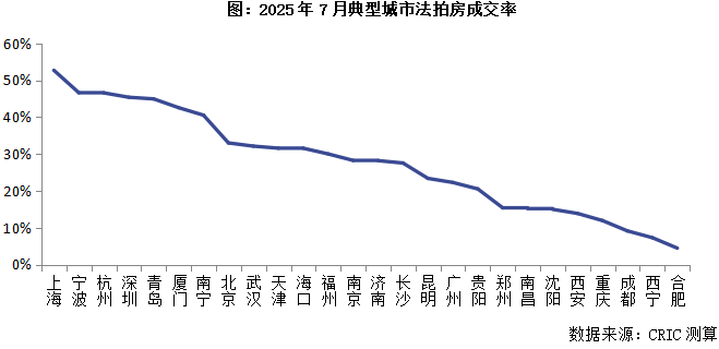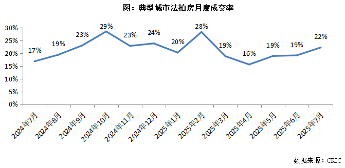 分城市来看,重点城市中上海以53%的成交率继续居于首位,杭州、宁波、深圳、厦门、青岛、南宁也超过40%。得益于市场供求关系的持续改善,随着“抄底”入市的资金增加,7月典型城市法拍房市场成交率延续年内高位。