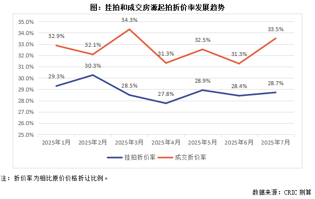 7月成交法拍房的平均折价率33.5%,环比大幅上升2.2个百分点,为年内第二高位;挂拍法拍房的平均起拍折价率为28.7%,环比上升0.3个百分点,较上月变化不大。因成交法拍房折价率大幅上升,挂拍折价率和成交折价率相差4.8个百分点,较上月差距明显扩大。本月平均成交折价率的提升,主要是由于高折价率的二拍房源成交占比大幅增加所致,本月有63%的成交房源为二次拍卖,成交占比较上月增加了20个百分点。本月买方明显加快了对于折扣力度较大房源的“抢收”节奏,更多此类房源已经接近买方的心理价位,也在侧面折射出需求方信心筑底的信号。