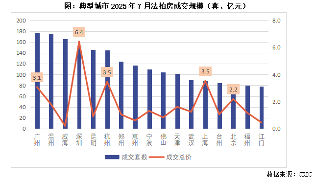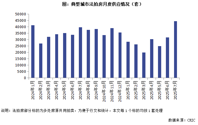 供应端方面,7月新增挂拍4.4万套,环比上升40%,同比上升12%。起拍总价443亿元,环比上升43%。本月新增挂拍套数、起拍总价双双达到2025年新高。