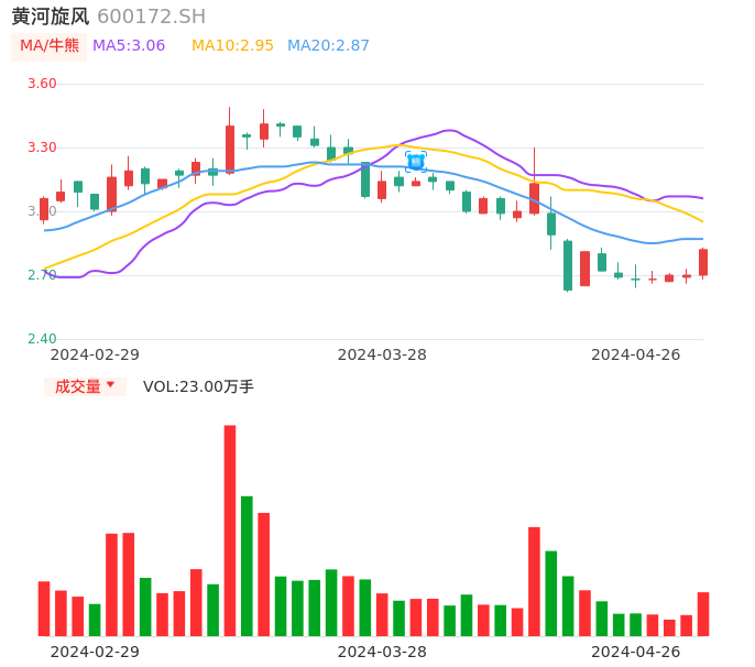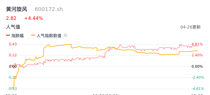 04月26日,黄河旋风收报2.82,股价涨幅4.44%,成交金额6384.15万元,换手率1.80%。