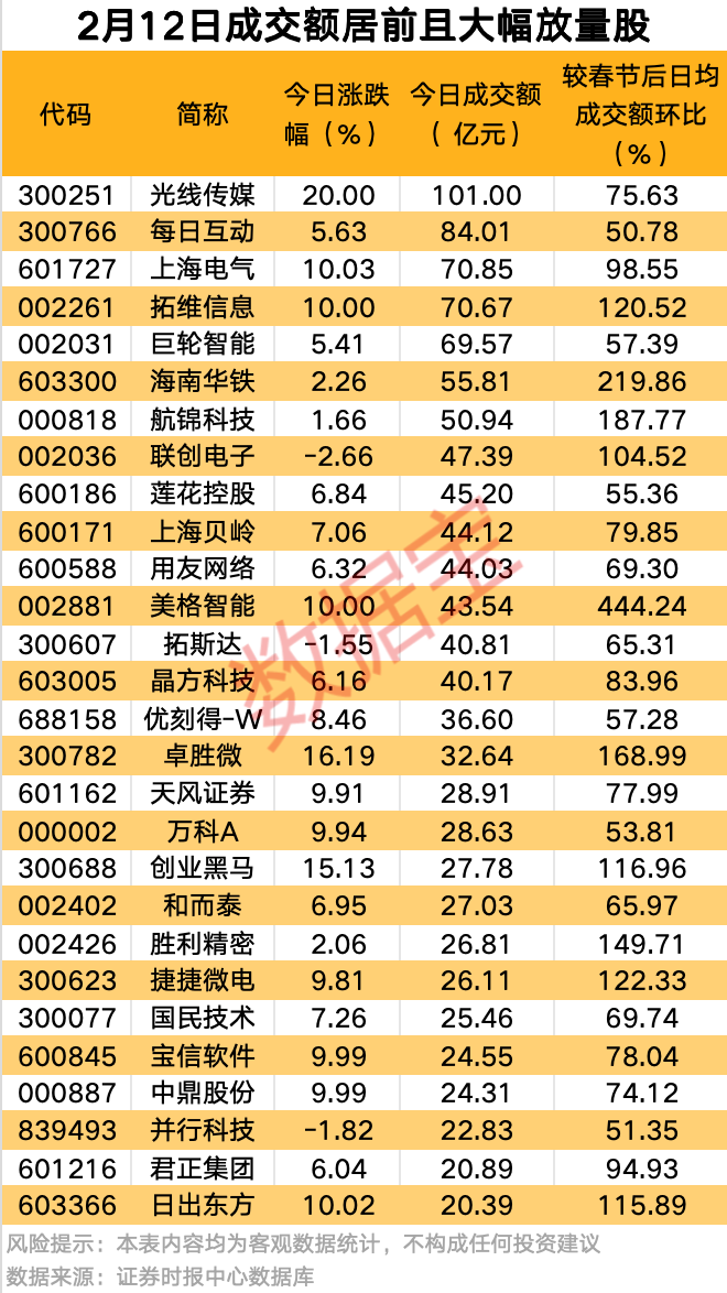 成交额方面,今日共3只股成交额超百亿元,分别是东方财富、浪潮信息、光线传媒,其中,光线传媒成交额首次超百亿元,今日成交额较春节后日均成交额放量75.63%。