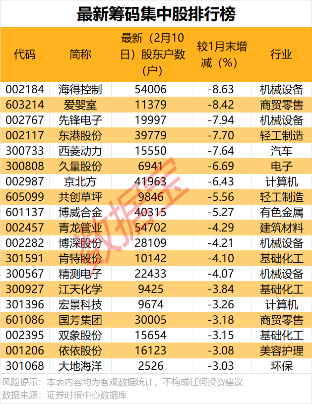 股东户数降幅最多的是海得控制,截至2月10日最新股东户数为54006户,较1月末下降8.63%;其次是爱婴室,截至2月10日最新股东户数为11379户,较1月末下降8.42%。