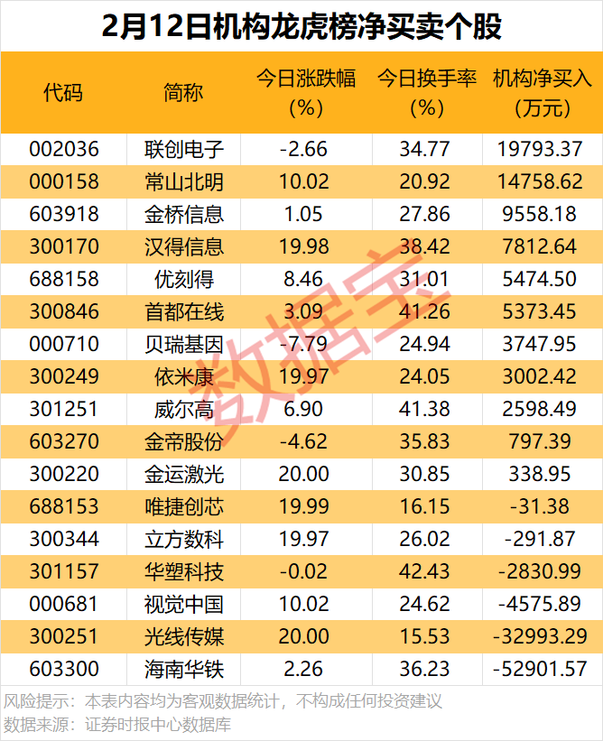 2月12日龙虎榜中,11股获机构净买入,净买入金额居首的是联创电子,机构净买入1.98亿元,其次是常山北明,机构净买入1.48亿元 。