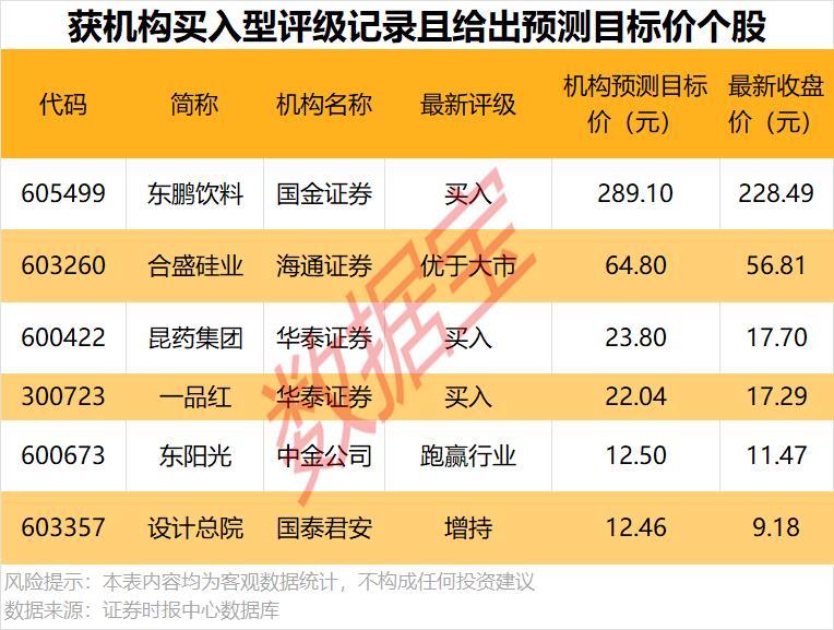 今日机构研报共发布24条买入型评级记录,共涉及23只个股,其中,有6条评级记录中对相关个股给出了未来目标价。