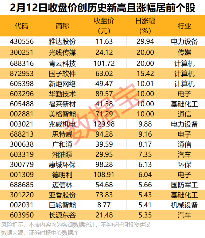 收盘创历史新高股中,今日股价平均上涨6.23%,涨停的有雅达股份、光线传媒、青云科技等,涨幅居前的有国子软件、兆威机电、思特威等。
