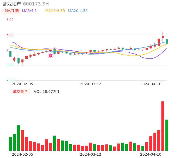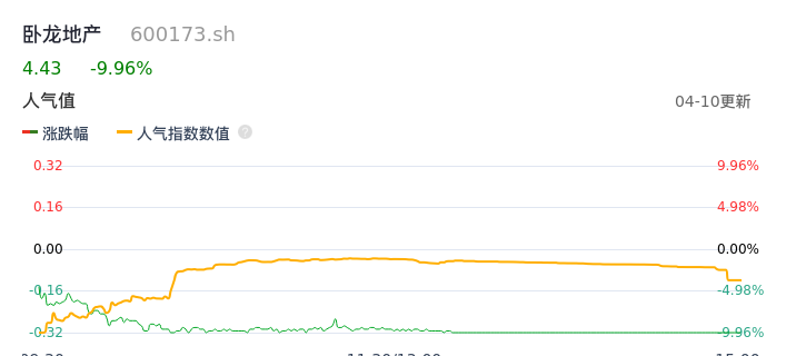 04月10日,卧龙地产收报4.43,股价涨幅-9.96%,成交金额1.30亿元,换手率4.09%。