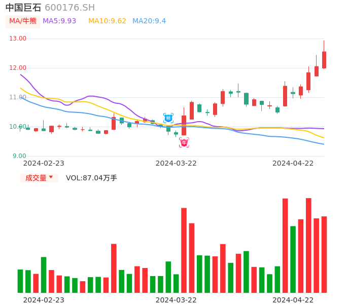 04月22日,中国巨石收报12.55,股价涨幅4.15%,成交金额10.80亿元,换手率2.17%。