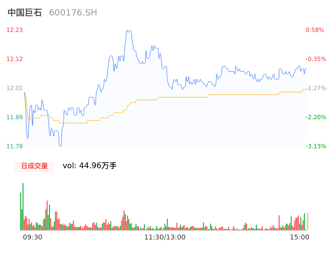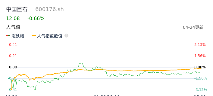 04月24日,中国巨石收报12.08,股价涨幅-0.66%,成交金额5.39亿元,换手率1.12%。