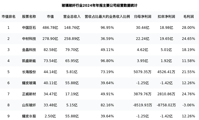 中国巨石最新报告期数据为年报,下表汇总了玻璃玻纤行业内市值靠前的公司年报主要经营数据