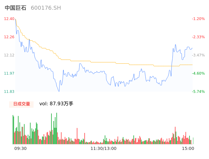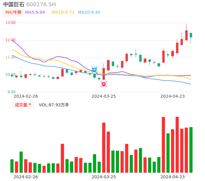 04月23日,中国巨石收报12.16,股价涨幅-3.11%,成交金额10.59亿元,换手率2.20%。