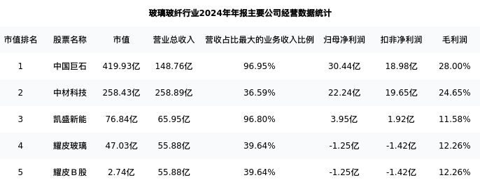 中国巨石最新报告期数据为年报,下表汇总了玻璃玻纤行业内市值靠前的公司年报主要经营数据