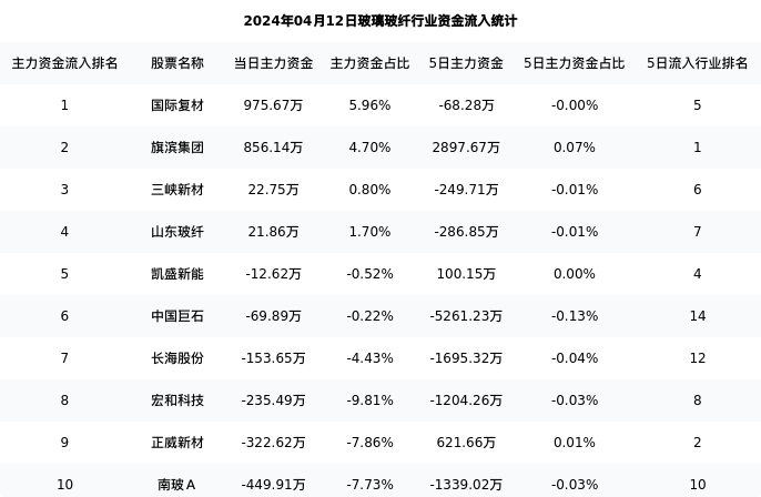 中国巨石今日净流出69.89万元,主力占比0.22%,在行业内排名:6/16;5日净流出5261.23万元,主力占比0.13%,在行业内排名:14/16。