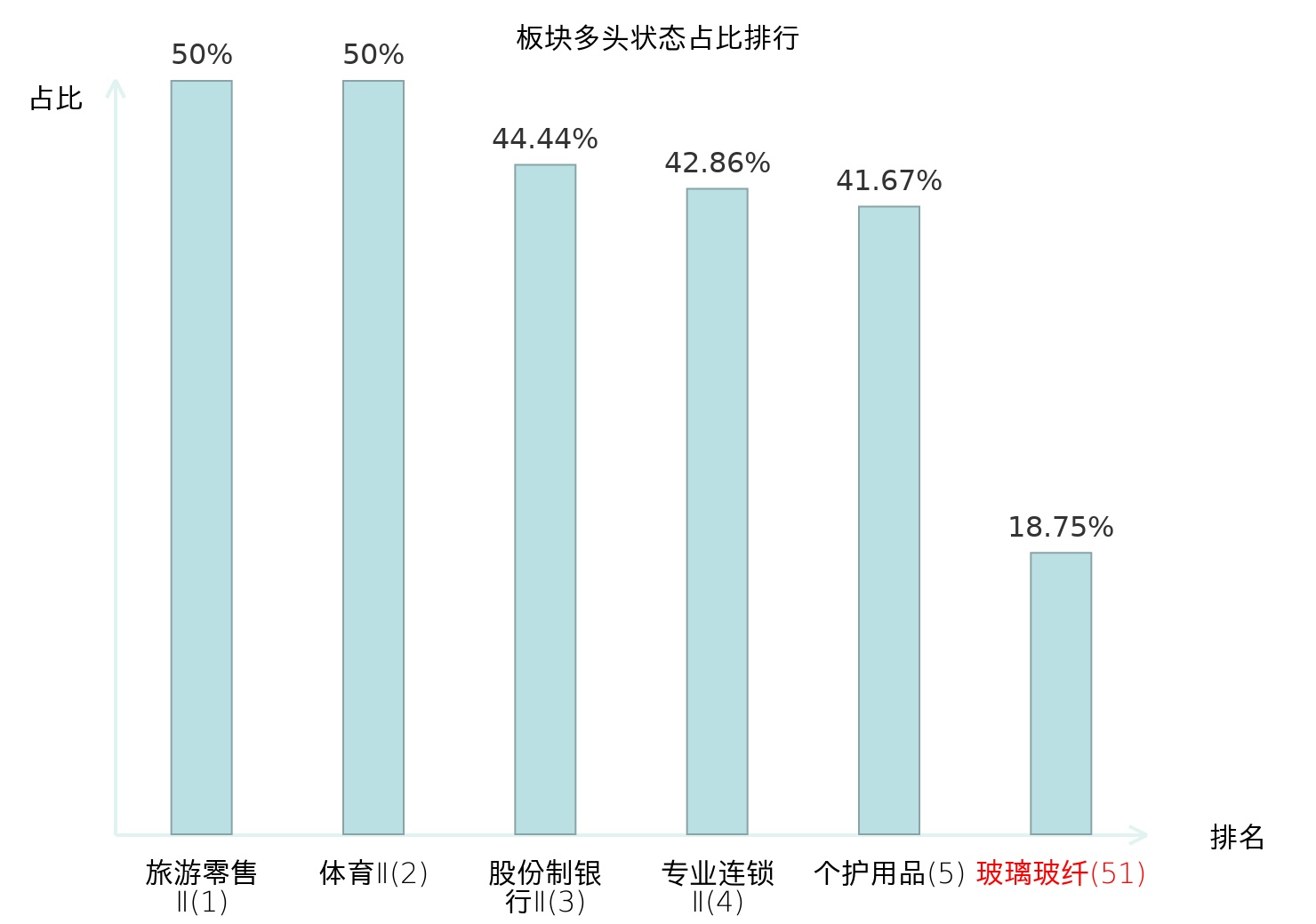 全市场所有行业板块中主力多头状态占比排名中,旅游零售Ⅱ板块位居第一。贵金属板块名次提升最快,较昨日上升83位。