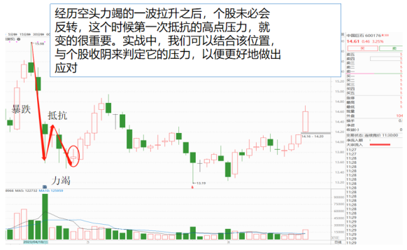 这里要注意两个压力:一是技术上的前期抵抗高点,当个股反弹至此后K线收阴,就会形成调整共振,要做出减仓应对;