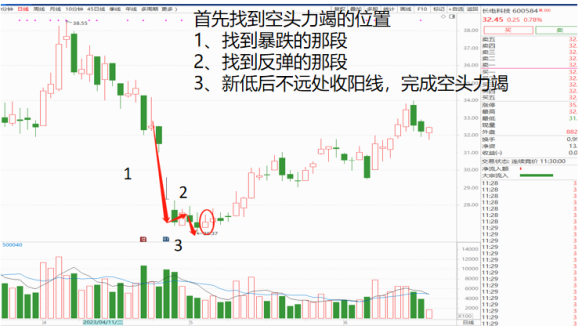 1、一波下跌之后,补仓的那个位置,是空头力竭点;