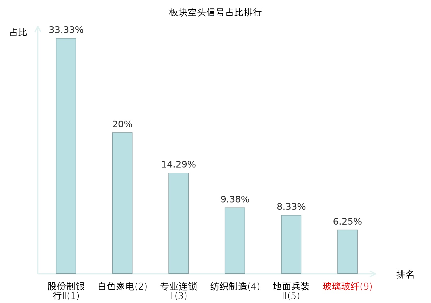 全市场所有行业板块中主力空头信号占比排名中,股份制银行Ⅱ板块位居第一。塑料板块名次提升最快,较昨日上升111位。