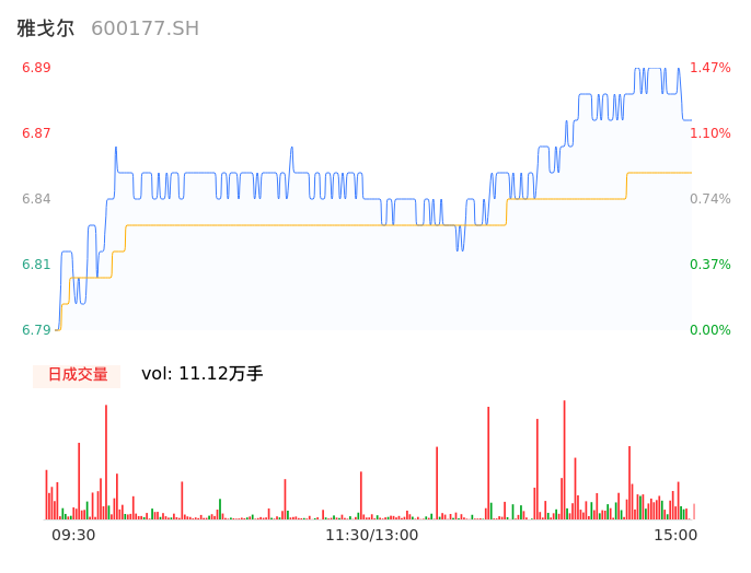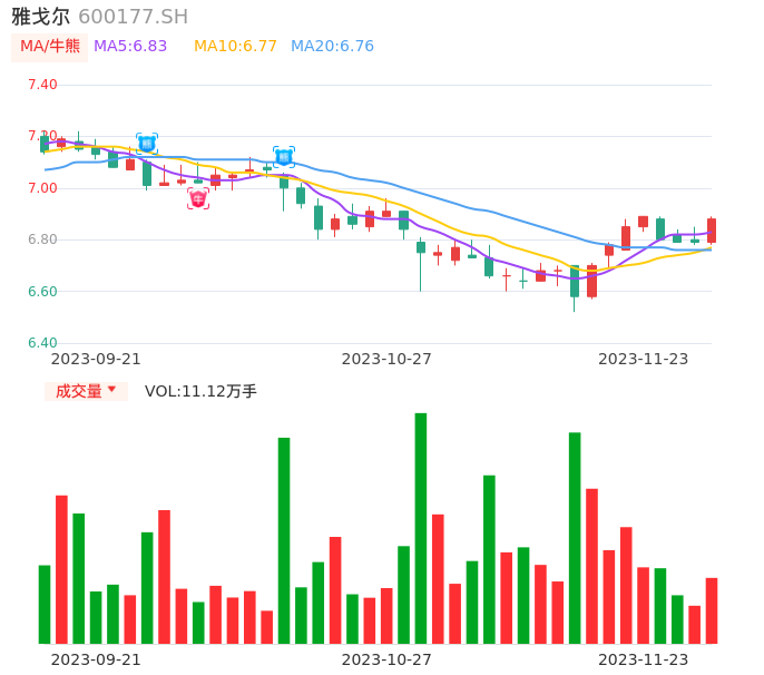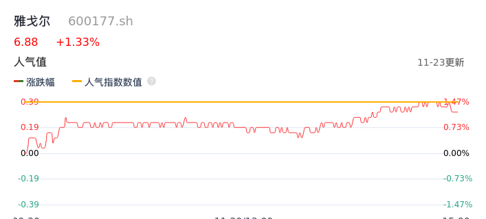 11月23日,雅戈尔收报6.88,股价涨幅1.33%,成交金额7619.34万元,换手率0.24%。