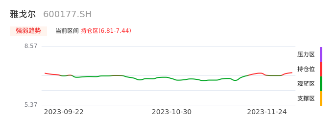 我们来看一下该股的九方特色指标强弱趋势的情况:雅戈尔近日从观望区上穿到持仓区。股价短期站稳多头区域,上升动能仍较为充足,可积极关注。后续重点关注上方压力位:7.44元是否能突破上攻。
