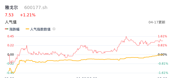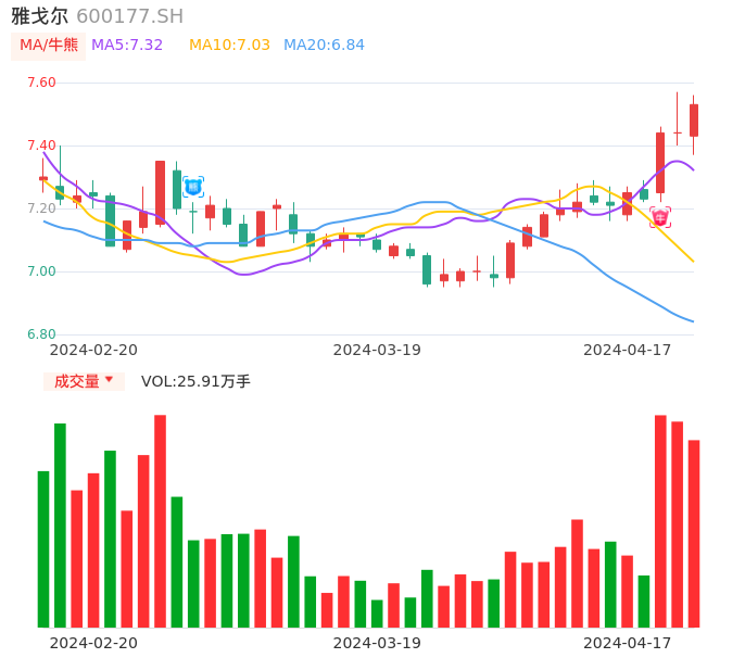 04月17日,雅戈尔收报7.53,股价涨幅1.21%,成交金额1.94亿元,换手率0.56%。