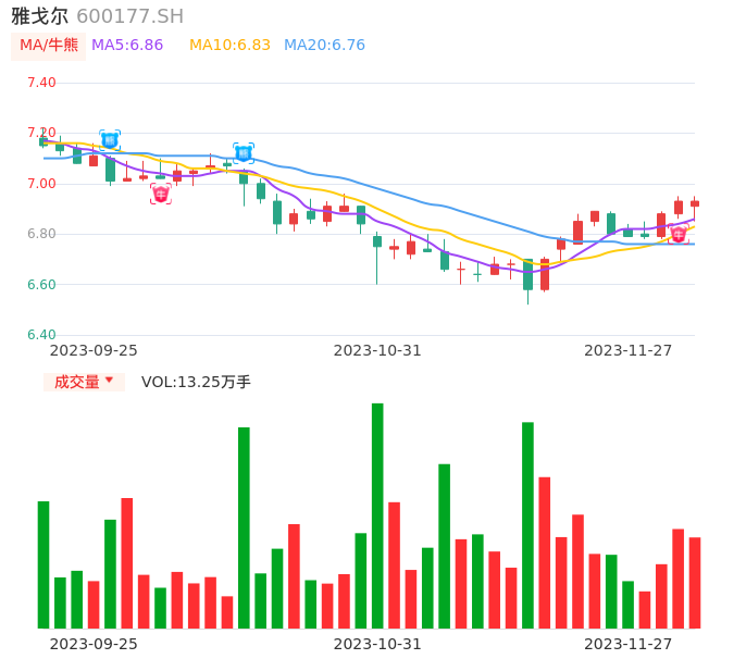 11月27日,雅戈尔收报6.93,股价涨幅0.00%,成交金额9144.52万元,换手率0.29%。