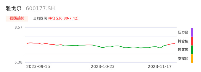 我们来看一下该股的九方特色指标强弱趋势的情况:雅戈尔近日从观望区上穿到持仓区。股价短期站稳多头区域,上升动能仍较为充足,可积极关注。后续重点关注上方压力位:7.42元是否能突破上攻。