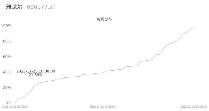 根据成交分布分析,该股票当天放量成交,成交清淡。时间上看,早盘前半小时成交量占据当天总成交量的21.59%;价格上看,成交呈现中间峰。成交分布分析主要研究股票成交的分布特性,不具有预测功能,请知悉。