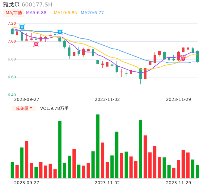 11月29日,雅戈尔收报6.77,股价涨幅-1.46%,成交金额6658.97万元,换手率0.21%。
