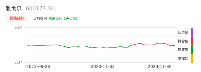 我们来看一下该股的九方特色指标强弱趋势的情况:雅戈尔近日从持仓区下穿到观望区,股价出现持续调整。短期出现止跌态势,后续重点关注能否再次站上多空分界点:6.82元。如未能有效突破则可能进入新一轮空头行情。
