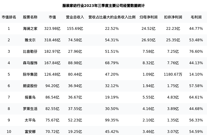 雅戈尔最新报告期数据为三季度,下表汇总了服装家纺行业内市值靠前的公司三季度主要经营数据