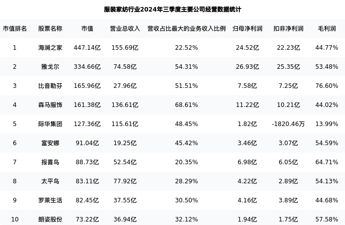 雅戈尔最新报告期数据为三季度,下表汇总了服装家纺行业内市值靠前的公司三季度主要经营数据