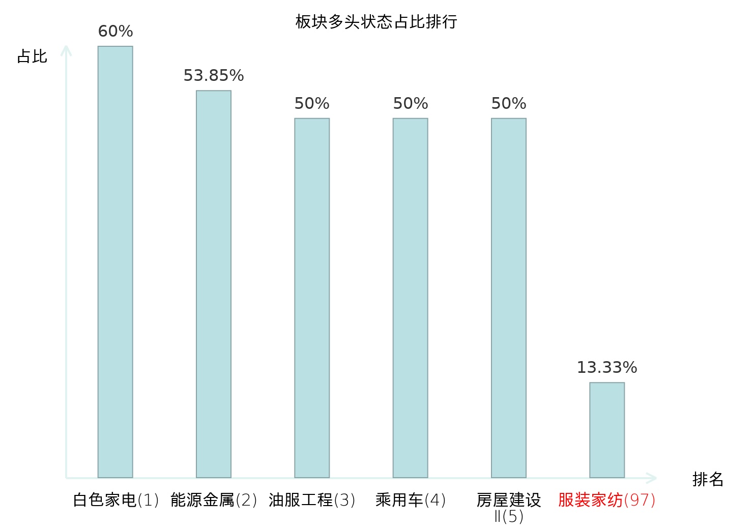 全市场所有行业板块中主力多头状态占比排名中,白色家电板块位居第一。油气开采Ⅱ板块名次提升最快,较昨日上升45位。