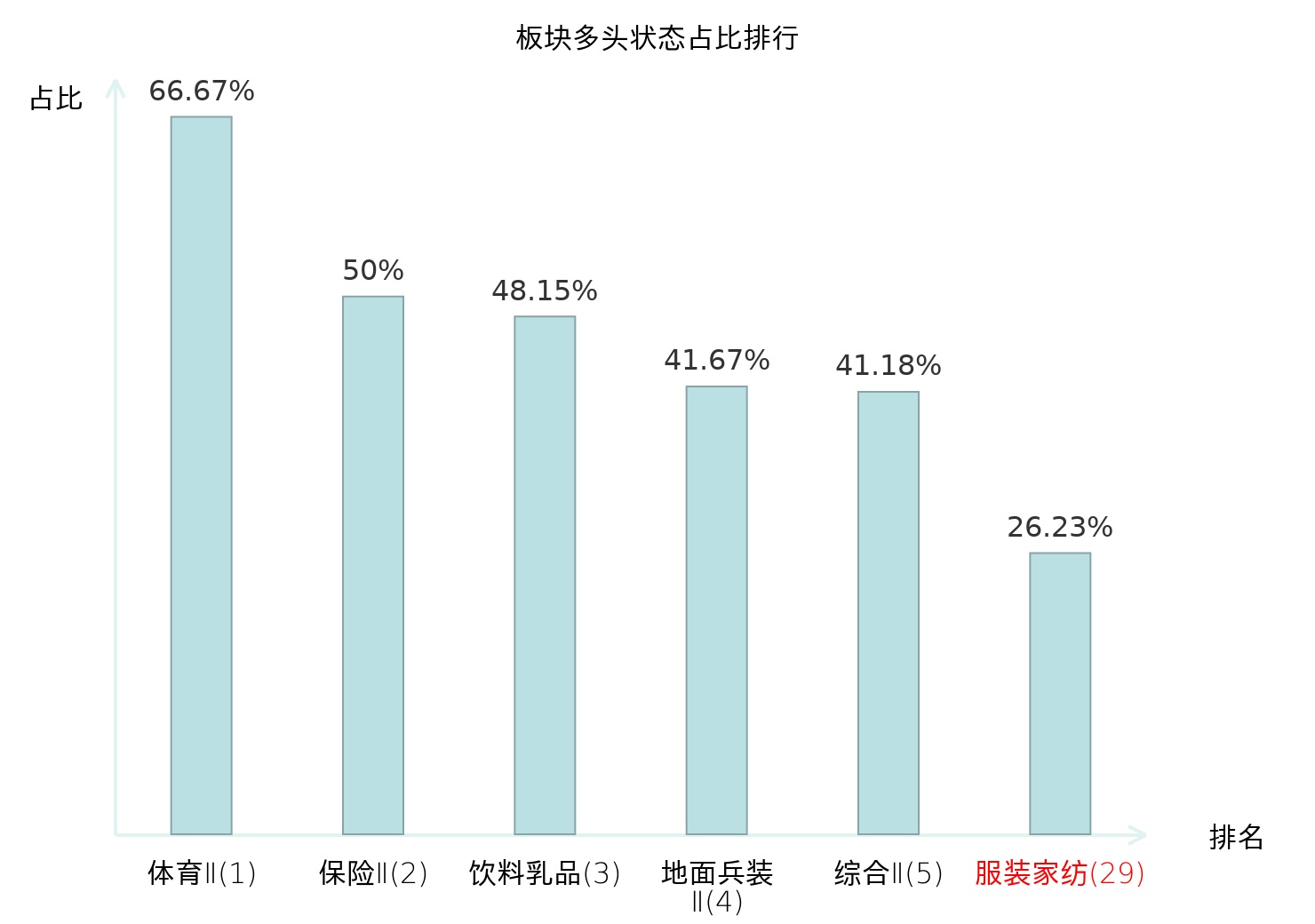 全市场所有行业板块中主力多头状态占比排名中,体育Ⅱ板块位居第一。种植业板块名次提升最快,较昨日上升70位。