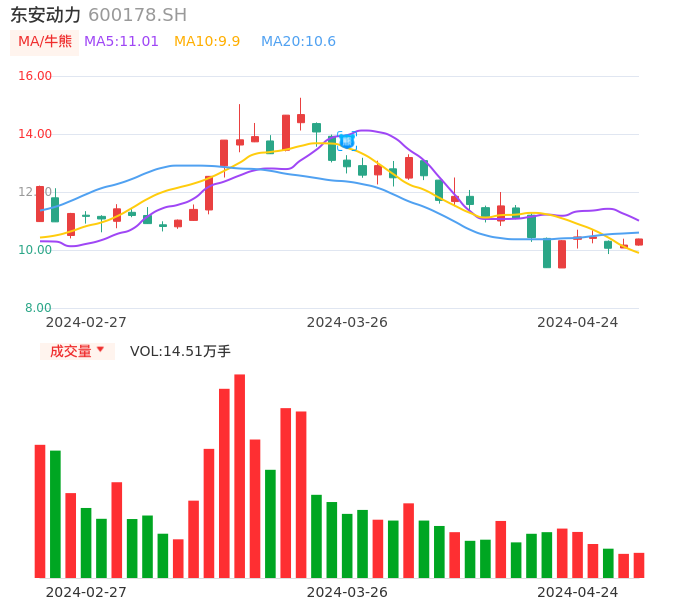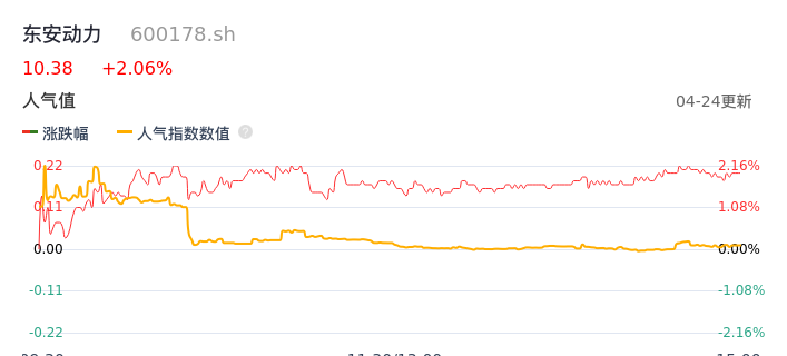 04月24日,东安动力收报10.38,股价涨幅2.06%,成交金额1.50亿元,换手率3.11%。
