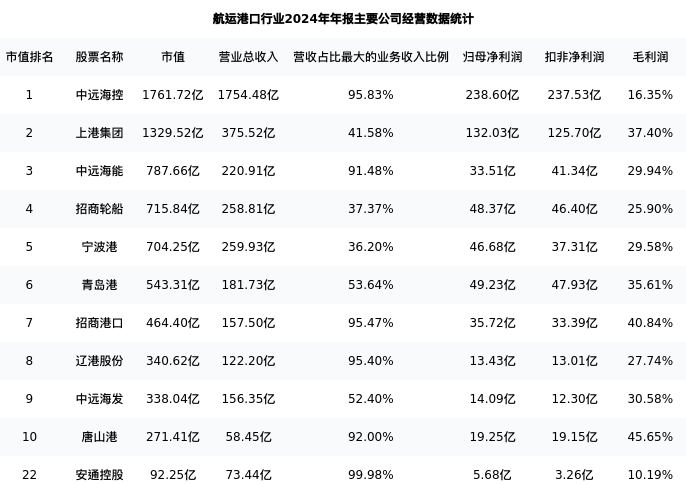 安通控股最新报告期数据为年报,下表汇总了航运港口行业内市值靠前的公司年报主要经营数据