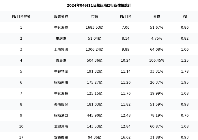 从估值角度看:安通控股最新市盈率PETTM为16.62,在行业内排名17/34,处于31.88分位。