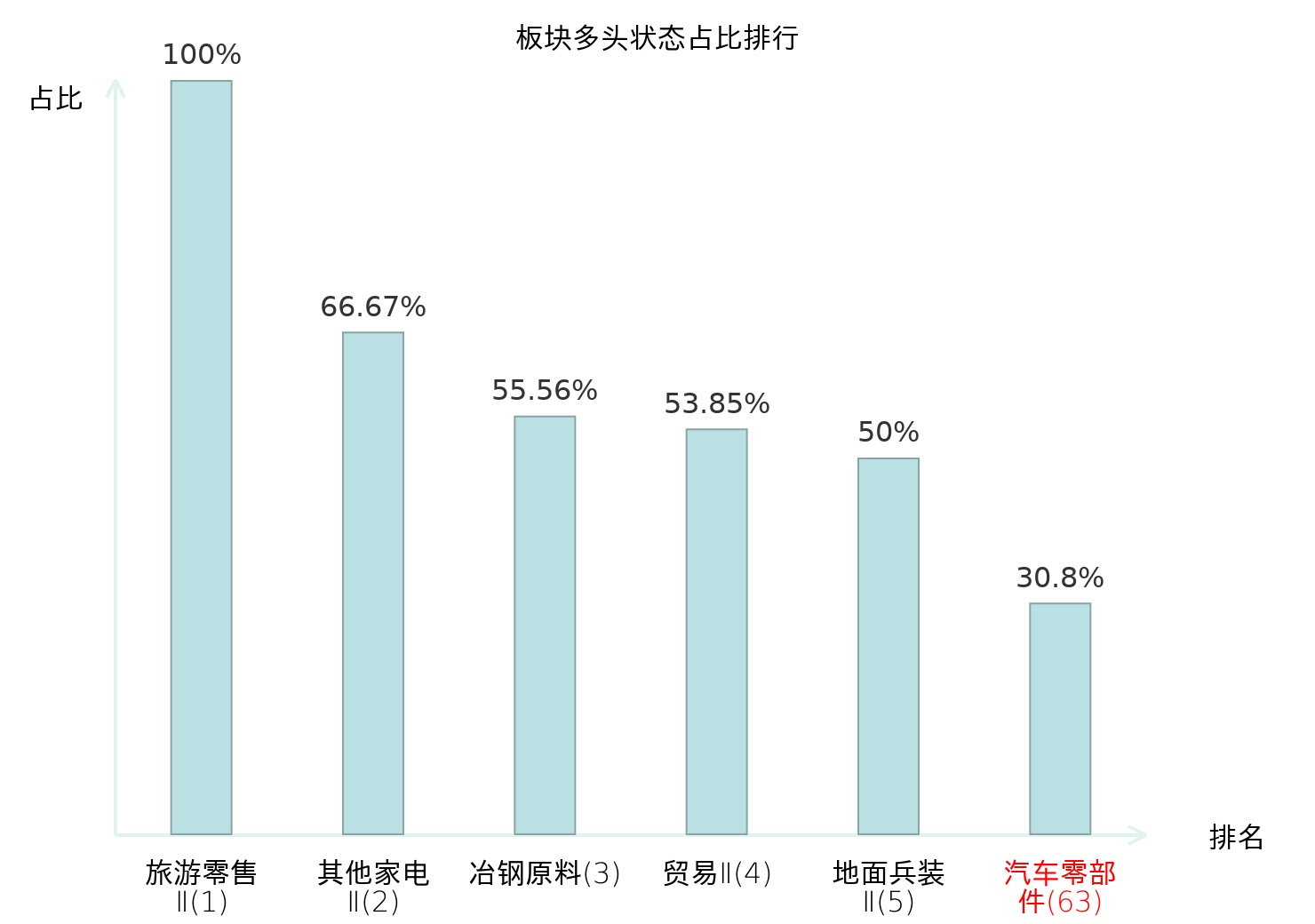 全市场所有行业板块中主力多头状态占比排名中,旅游零售Ⅱ板块位居第一。房屋建设Ⅱ板块名次提升最快,较昨日上升58位。