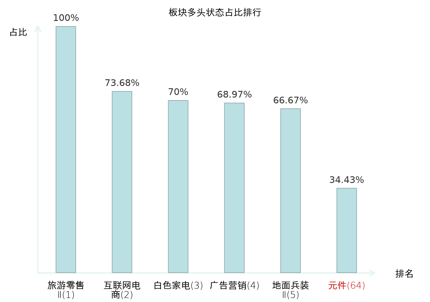 全市场所有行业板块中主力多头状态占比排名中,旅游零售Ⅱ板块位居第一。厨卫电器板块名次提升最快,较昨日上升76位。