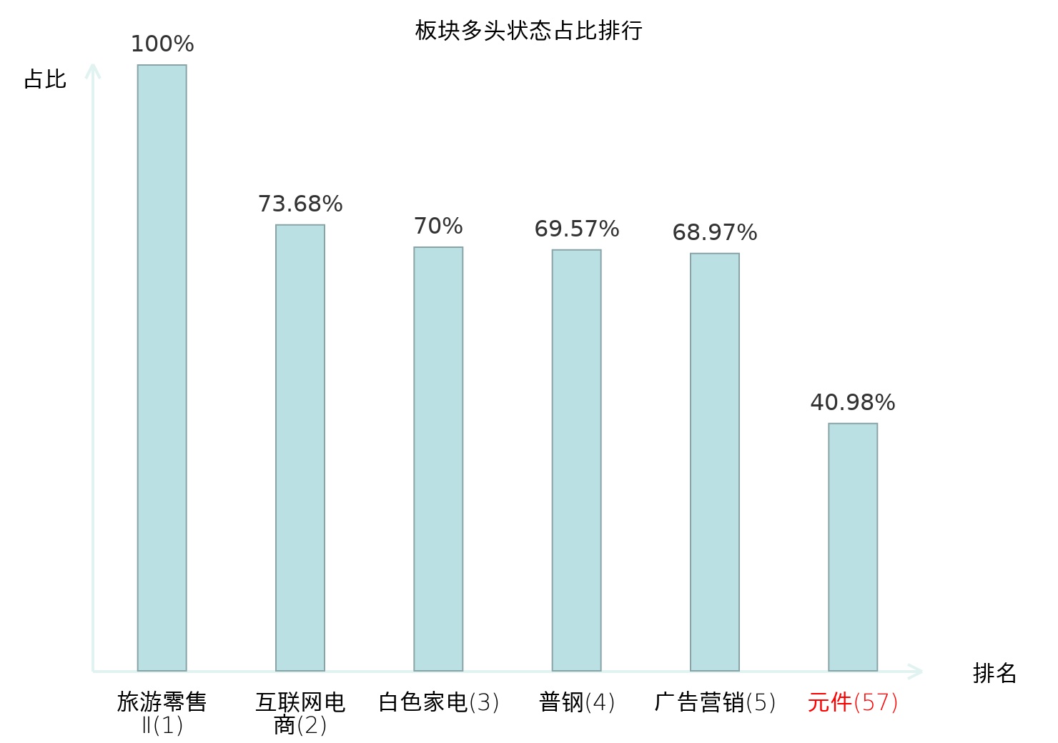 全市场所有行业板块中主力多头状态占比排名中,旅游零售Ⅱ板块位居第一。其他家电Ⅱ板块名次提升最快,较昨日上升66位。