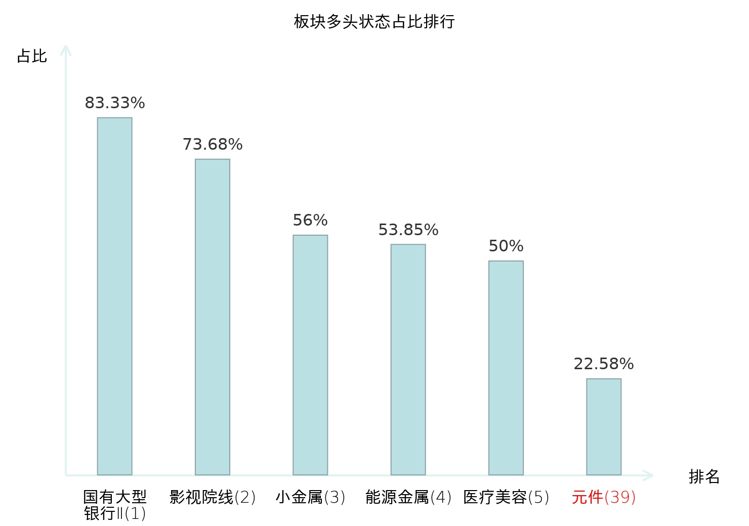 全市场所有行业板块中主力多头状态占比排名中,国有大型银行Ⅱ板块位居第一。电视广播Ⅱ板块名次提升最快,较昨日上升99位。