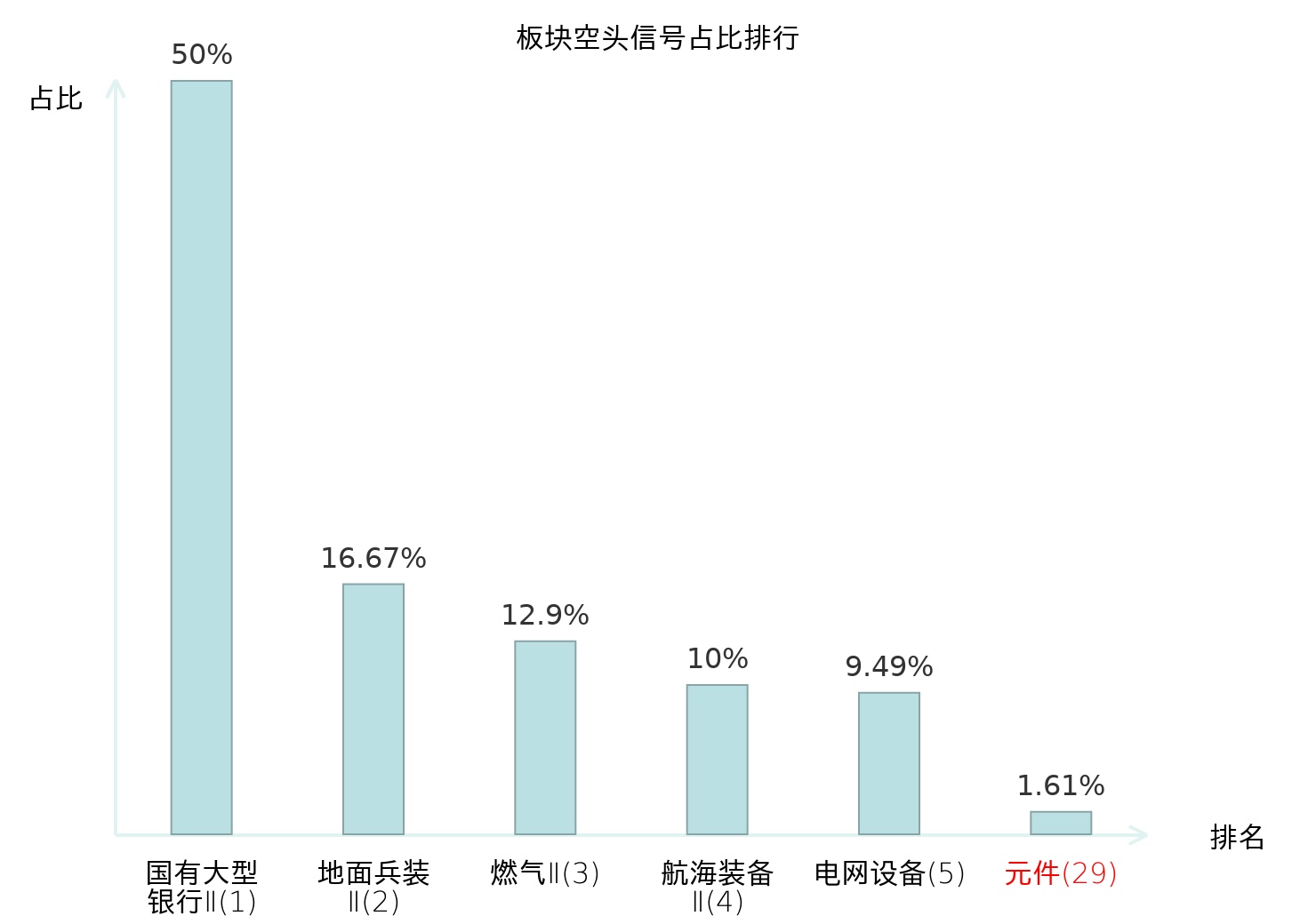 全市场所有行业板块中主力空头信号占比排名中,国有大型银行Ⅱ板块位居第一。电池板块名次提升最快,较昨日上升115位。