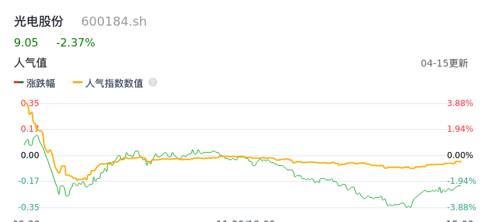 04月15日,光电股份收报9.05,股价涨幅-2.37%,成交金额5137.34万元,换手率1.11%。