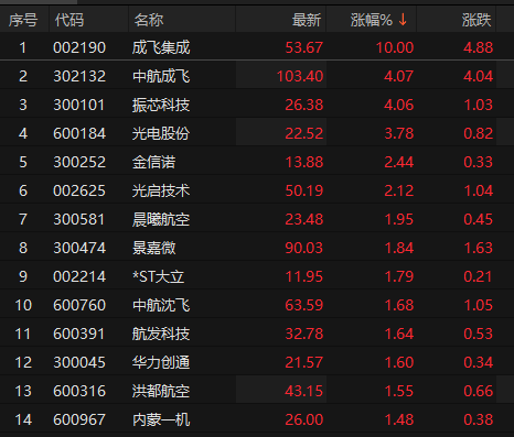 上证报中国证券网讯 8月25日早盘,国防军工板块震荡走高,截至9时57分,成飞集成涨停,收获4连板,中航成飞、振芯科技涨逾4%,光电股份、金信诺等跟涨。