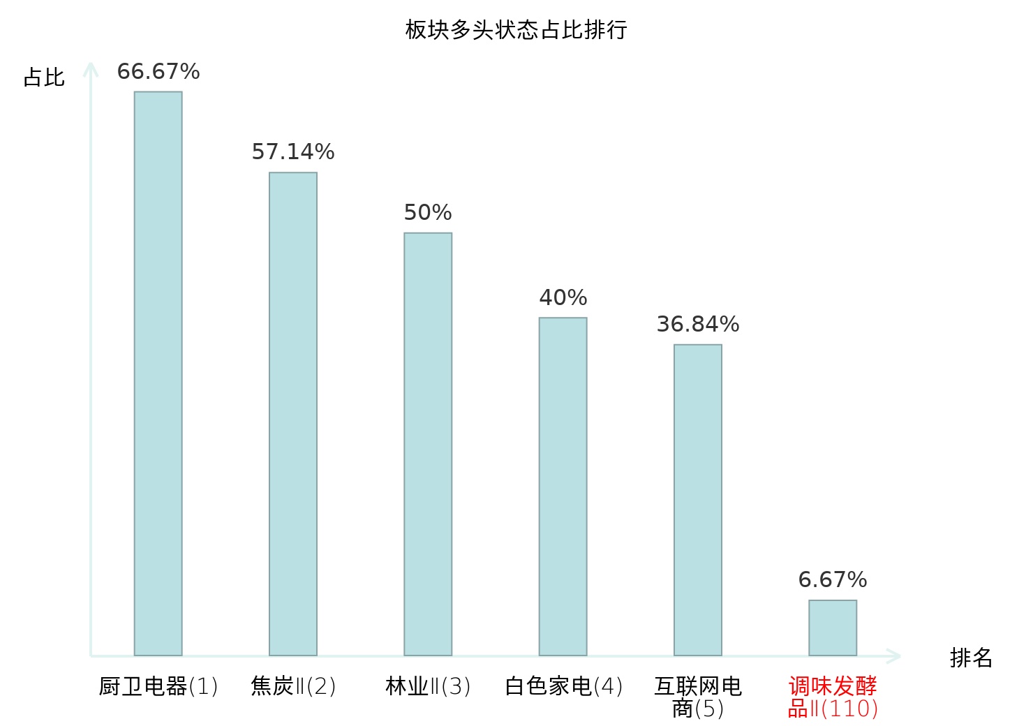 全市场所有行业板块中主力多头状态占比排名中,厨卫电器板块位居第一。铁路公路板块名次提升最快,较昨日上升53位。